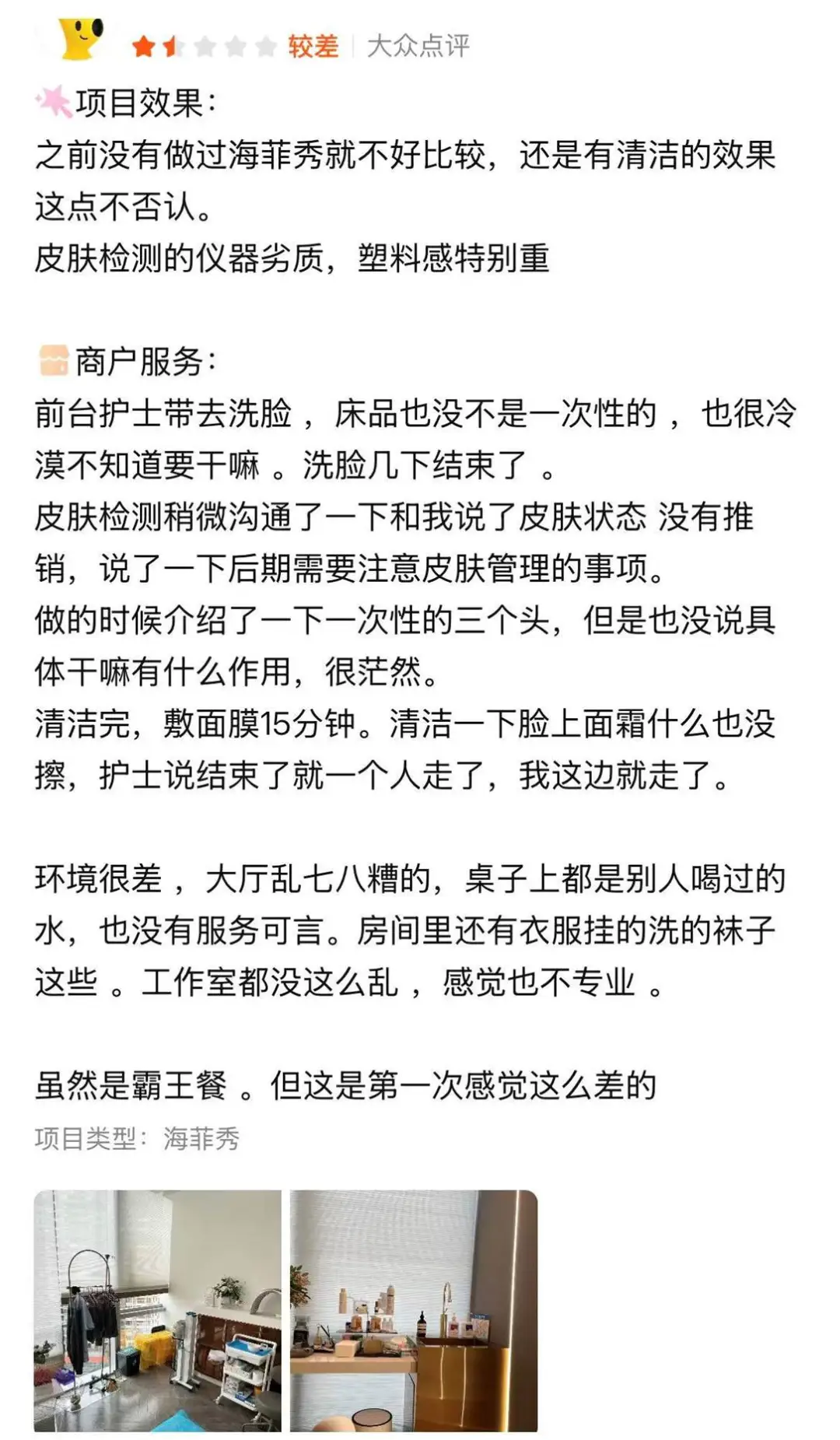 工作人员不仅不做皮肤评估,连基础面诊都省略,操作期间更是零交流、零交接,到时间了就推门进来撕膜即赶人,既不擦净多余精华,也不涂面霜锁水,更无术后注意事项,与“海菲秀”官方要求的步骤严重不符。