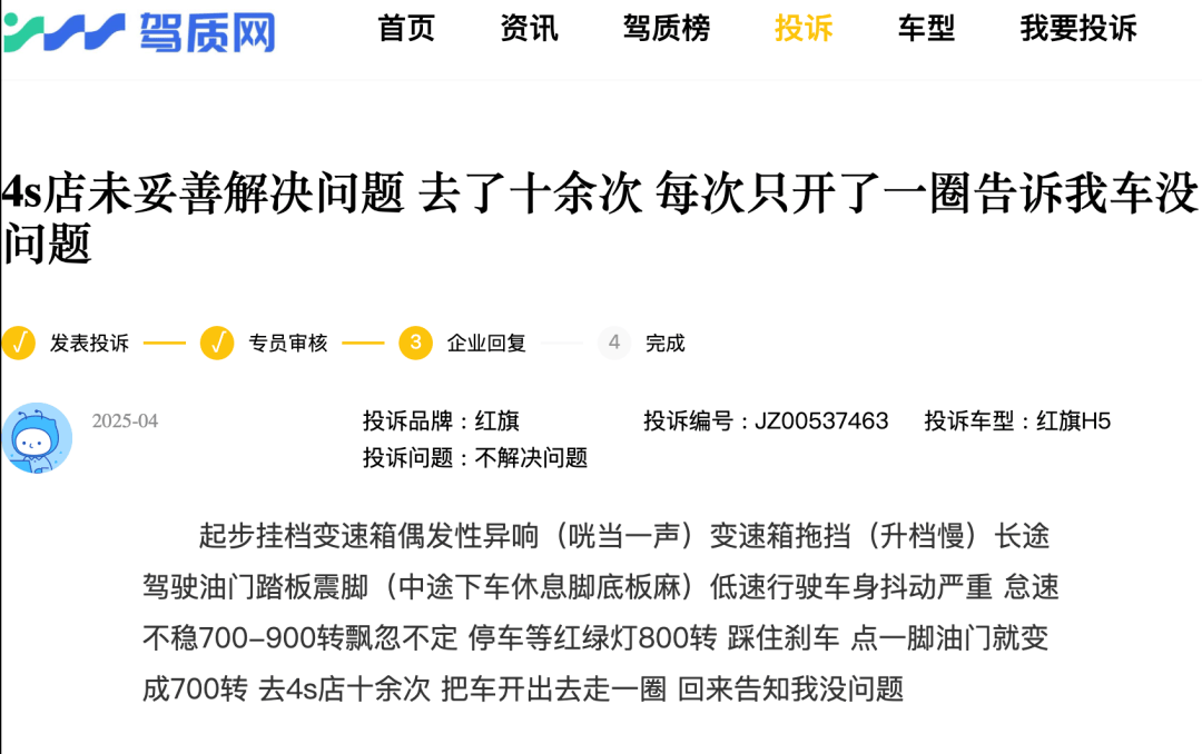 更有车主投诉车辆存在其他严重问题。娄先生反映其红旗H5购入后陆续出现变速箱异响、升档逻辑混乱、油门踏板震动、低速抖动及怠速转速波动等现象。为了解决这些问题,娄先生十余次前往当地红旗4S店,但4S店的处理方式却难以令人接受。工作人员每次仅以常规路试为主,对于车辆出现的异常没有给出合理的解释,仅仅凭借路试的主观感觉告知车主车辆没有问题。这种漠视问题的态度让娄先生倍感沮丧,他不仅对4S店缺乏实质性行动感到失望,更担忧自己的车辆安全问题。