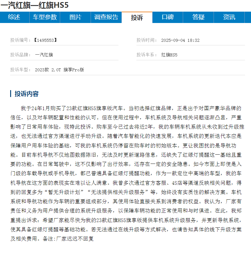 事实上,自2022年起,便有不少车主在各大平台反映H5和HS5车机升级困难,甚至自发探讨破解方法。尽管问题存在已久,但并未引起广泛重视,直至今年7月,相关投诉才大规模爆发。