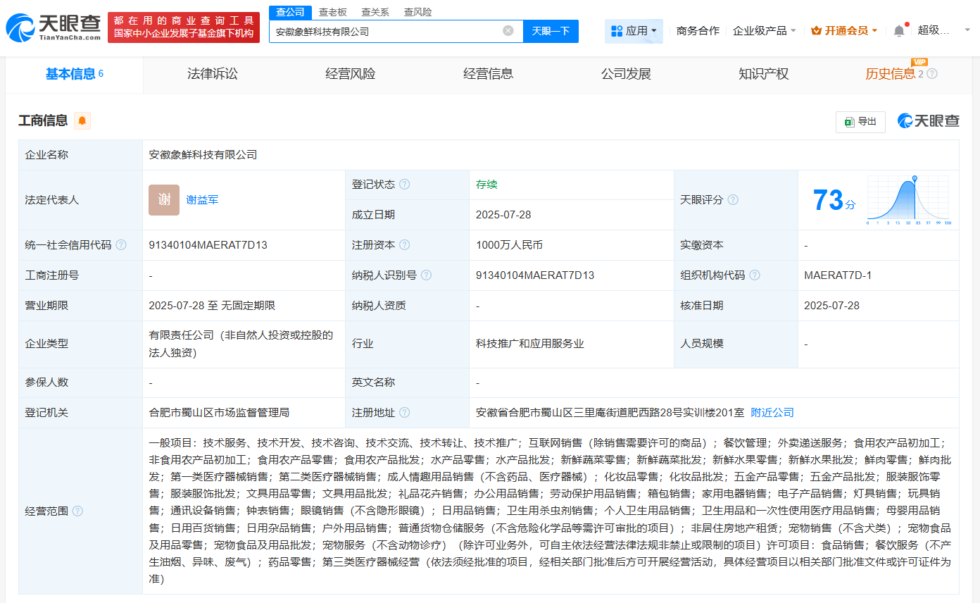 天眼查App显示,近日,安徽象鲜科技有限公司成立,法定代表人为谢益军,注册资本1000万人民币,经营范围包括互联网销售、餐饮管理、外卖递送服务、食品销售等。