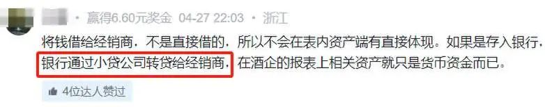 泸州老窖(上市公司)利用良好的信用,从银行获取巨额长期贷款,然后存入银行(存活期)。再通过小贷公司的渠道转贷给下游经销商,完成资金闭环!这实际上是表外循环,不会体现在泸州老窖财报上。
