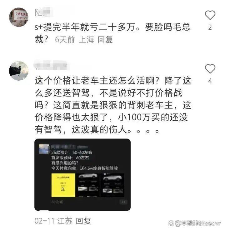 2月14日情人节,莲花汽车以“降价18万”的“浪漫礼物”点燃老车主怒火。厦门一位购买两辆EMEYA繁花的车主控诉,同配置车型半年内差价达30万元,二手车残值从六七十万暴跌至四五十万,品牌方却未提供任何补偿方案。更讽刺的是,2024年7月路特斯集团CEO冯擎峰还信誓旦旦承诺“绝不参与价格战”,半年后却自食其言,被车主怒斥“品牌信誉破产”。