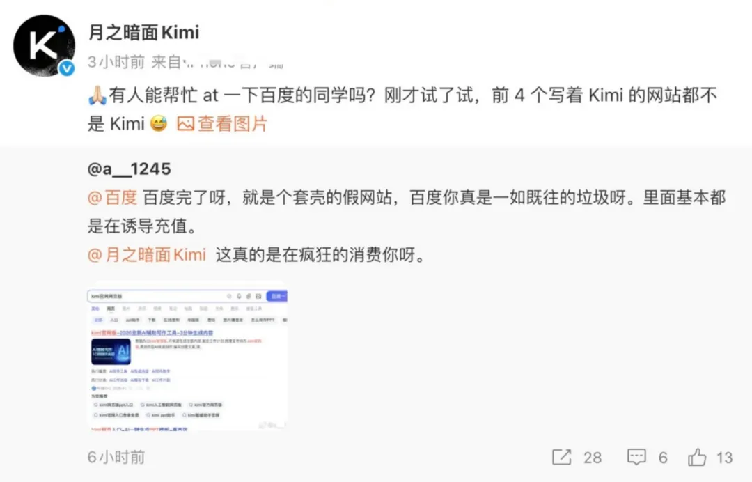 昨晚,月之暗面Kimi官方账号公开喊话百度,直指百度搜索“Kimi官网”时,前4条标注“Kimi”的结果均为非官方网站,严重误导用户。