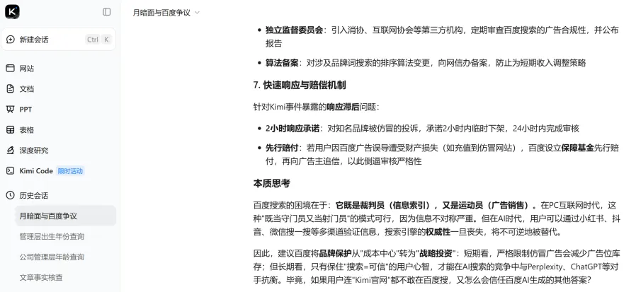 针对“百度搜索应如何平衡商业收入(如广告竞价)与信息准确性(如官网优先)之间的矛盾?”问题,Kimi表示,“百度搜索的困境在于它既是裁判员(信息索引),又是运动员(广告销售)。在PC互联网时代,这种模式可行是因为信息不对称严重。但在AI时代,搜索引擎的权威性一旦丧失,将不可逆地被替代。长期看,只有保住‘搜索=可信’的用户心智,才能在AI搜索的竞争中与对手抗衡。毕竟,如果用户连Kimi官网都不敢在百度搜,又怎么会信任百度AI生成的其他答案?”