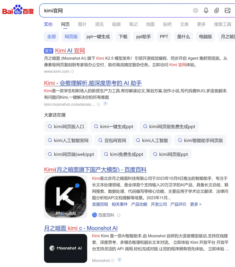 在舆论发酵后,百度已悄悄优化了搜索结果,Kimi官方网页被置顶展示,并带有明显的“官方”认证标识,前面多条结果中也不再出现非官方广告。其后,月之暗面Kimi官方微博也发文表示“已恢复。”