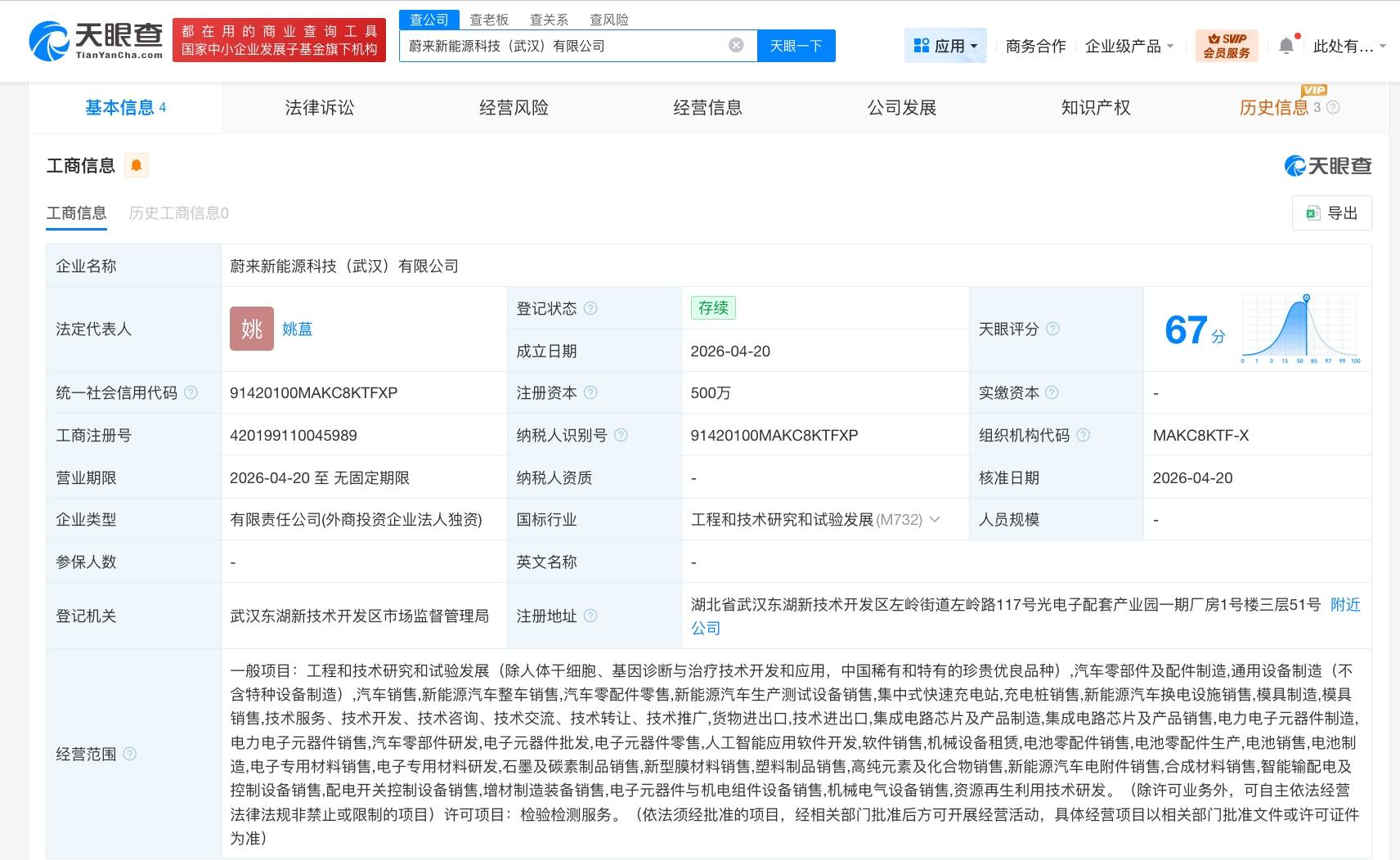 天眼查App显示,近日,蔚来新能源科技(武汉)有限公司成立,法定代表人为姚蒀,注册资本500万人民币,经营范围含工程和技术研究和试验发展、汽车销售、新能源汽车整车销售、汽车零配件零售、新能源汽车生产测试设备销售、集中式快速充电站、新能源汽车换电设施销售等。