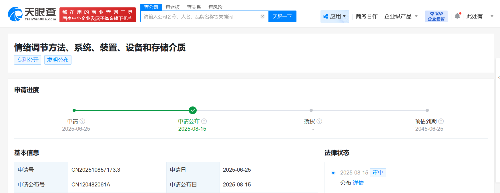 天眼查App显示,近日,奇瑞汽车股份有限公司申请的“情绪调节方法、系统、装置、设备和存储介质”专利公布。
