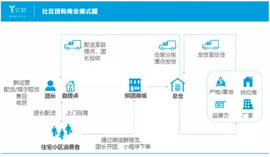 社区团购的商业模式并不复杂,它是由团长发起一些商品的团购,让住宅小区的消费者在微信群中接龙下单,然后由商家将团购商品送至小区门口的提货点,由消费者自提或者团长配送。