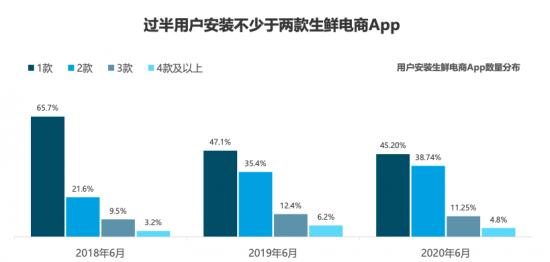 据极数统计,在过半用户的手机内,都装有两款或两款以上的生鲜电商APP,仅一款生鲜电商APP的比例。这也是“食已不多”的表现。要知道,2018年仅按照一款生鲜电商的APP就高达65.7%,现在已经下降到了的45.2%。
