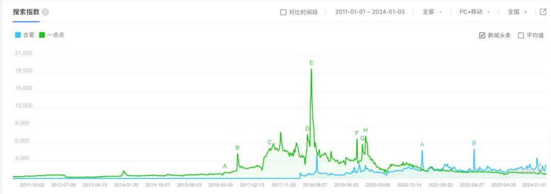 为了进一步求证这一情况,伯虎财经在百度指数上进行了多番对比。自2017年以来,对比古茗、蜜雪冰城、喜茶、霸王茶姬的搜索指数,古茗整体“垫底”,与蜜雪冰城保持着较大的热度差距,更是被2023年走红的霸王茶姬“遥遥领先”。