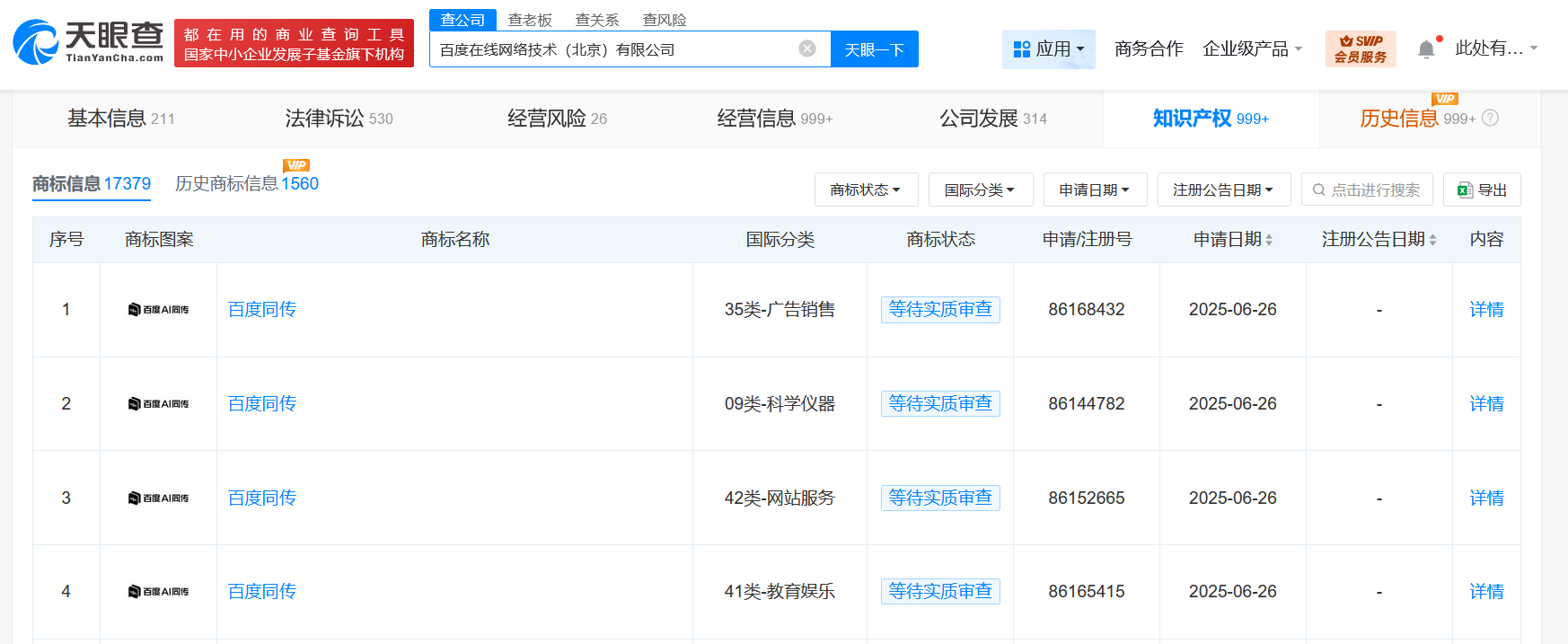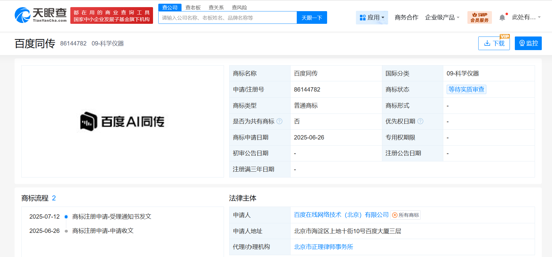 天眼查App显示,近日,百度在线网络技术(北京)有限公司申请注册多枚“百度AI同传”商标,国际分类为科学仪器、网站服务、教育娱乐等,当前商标状态均为等待实质审查。