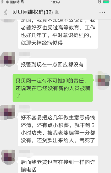 陈女士作为此次集体维权的一员,在聚投诉平台上详细地阐述了自己的经历。“我在贝贝网买拉拉裤,过了十几天,冒充贝贝的客服联系我说拉拉裤有问题,公司集体收回,快递还亲自上门提,并详细地说了我买时间、收件地点、姓名和电话,然后我就信了。对方发过来贝贝网的网站,绑了我的银行卡,卡里没钱对方就说到其他网站打钱刷信誉度,然后刷出来钱不用还,我就分别在小米金融、网商贷、百度有钱花等平台借了钱,连本带息被骗了76000块。”