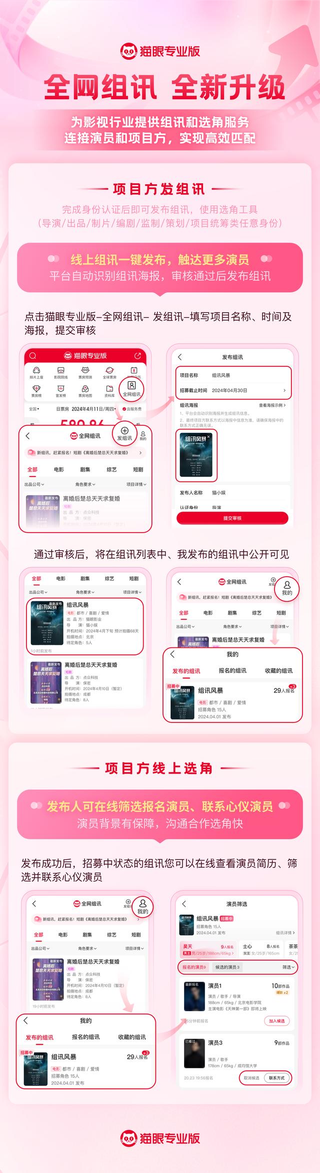 在推出PC版的同时,猫眼专业版积极发挥平台属性和行业价值,从电影行业服务角度出发,在APP端上线了「全网组讯」及「影人认领」功能,通过双向筛选,实现项目方与影人的高效匹配,进而提升电影制作效率。