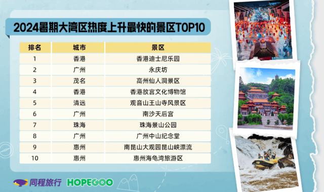 随着大湾区内旅游消费需求的强劲复苏,粤港两地多个知名景区的预订热度快速上升,其中热度上升最快的前十个景区依次为:香港迪士尼乐园、永庆坊、高州仙人洞景区、香港故宫文化博物馆、观音山王山寺风景区、南沙天后宫、珠海景山公园、广州中山纪念堂、南昆山大观园昆山峡漂流、惠州海龟湾旅游区。