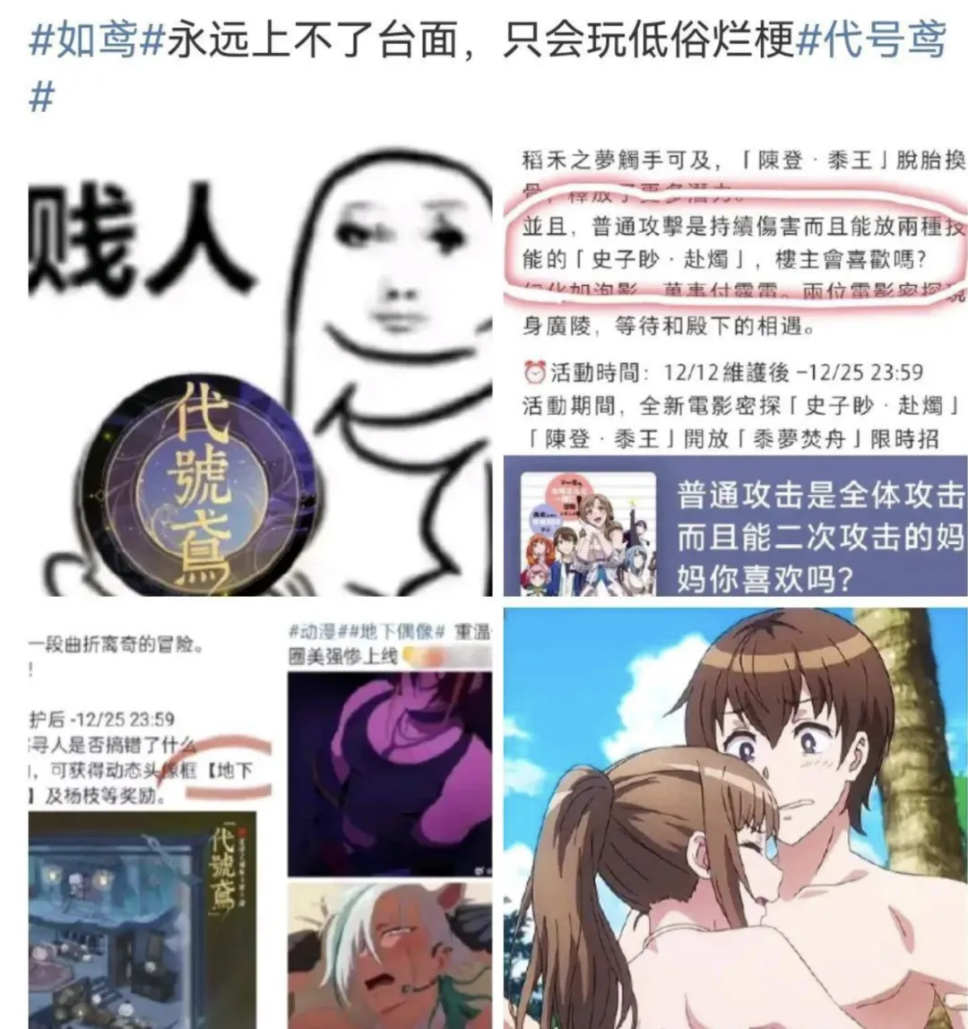 《如鸢》翻车早有苗头。部分游戏文案和剧情存在“辱女”、“恶俗”争议。如“熏鸡梗”被指消费女性,限定活动男NPC“手指钻洞”的情节令人生理不适。