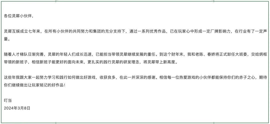 2024年3月,掌舵灵犀7年的詹钟晖卸任,《三战》制作人周炳枢接棒,同时多位90后业务骨干也进入核心管理岗。团队全面年轻化,与阿里年轻化策略同步,既是在修复“走火入魔论”背后的问题,也是在逐步向母体的价值、文化和治理靠拢。