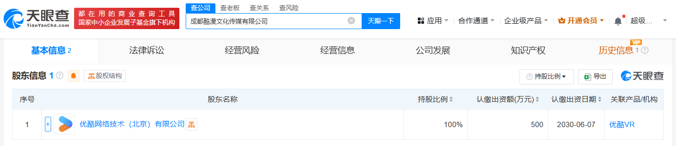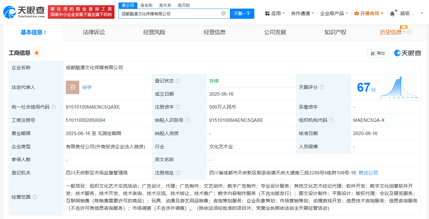 天眼查App显示,近日,成都酷漫文化传媒有限公司成立,法定代表人为谷宇,注册资本500万人民币,经营范围包括组织文化艺术交流活动、文艺创作、数字广告制作等,由优酷网络技术(北京)有限公司全资持股。