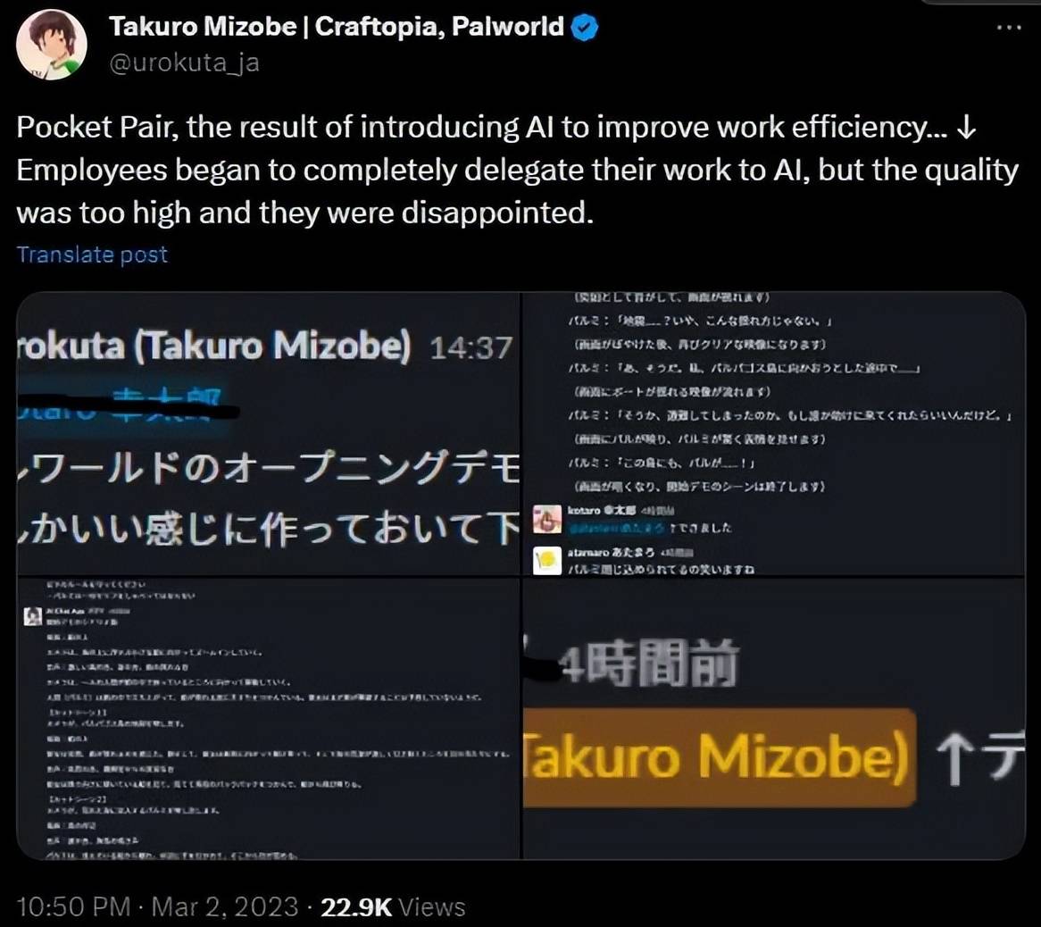 更重要的是,这家公司的CEO溝部拓郎自己就是生成式AI的激进拥护者,在这款游戏大火之后,大家才看到他在X上过去一两年对于AIGC创作的赞赏态度。进一步让人怀疑《幻兽帕鲁》背后是不是应用了AIGC技术的加持。