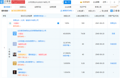 企查查股权穿透显示,该公司由百度关联公司百图生科(北京)智能技术有限公司100%控股。