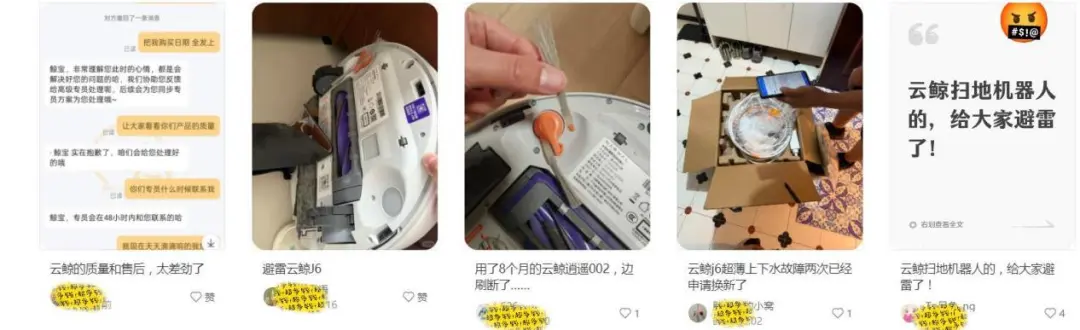 无独有偶,在小红书平台,也有很多关于云鲸扫地机的拔草贴,仅时间线靠前排的贴子中,就不大量“质量和售后太差劲”、“逍遥002边刷断了”、“J6超薄上下水故障2次申请换新”……的避雷贴。