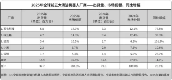 IDC 数据显示,2025 年全球清洁机器人厂商排名中,石头科技以580万台出货量稳居第一,科沃斯、追觅分别以 470 万台、340 万台位列二、三名。其中,云鲸排在第五位。从全球市场份额来看,排名第一的石头科技高达17.7%,而云鲸份额为 5.3%。