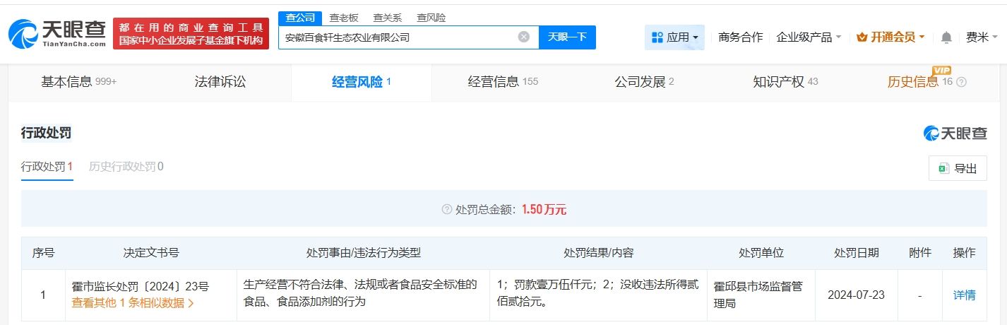 天眼查工商信息显示,该食品委托商安徽百食轩生态农业有限公司成立于2019年5月,法定代表人为赵光星,注册资本2000万人民币,经营范围包括食品生产、动物饲养、渔业捕捞等。股东信息显示,该公司由赵光星、赵明伟、赵明望共同持股。天眼风险信息显示,该公司曾因生产经营不符合法律、法规或者食品安全标准的食品、食品添加剂的行为,被霍邱县市场监督管理局罚款1.5万元,没收违法所得220元。此外,该公司曾被霍邱县市场监督管理局多次责令整改。