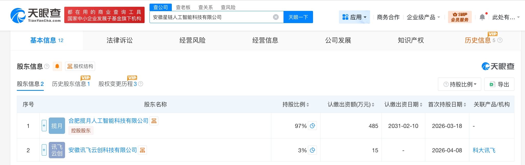 安徽星链人工智能科技有限公司成立于今年2月,法定代表人为方家珍,注册资本500万人民币,经营范围含人工智能应用软件开发、人工智能基础软件开发、人工智能通用应用系统、人工智能硬件销售等。股东信息显示,该公司目前由合肥揽月人工智能科技有限公司、安徽讯飞云创科技有限公司分别持股97%、3%。