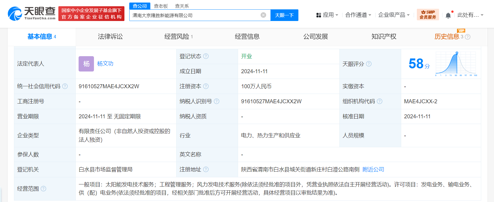 天眼查App显示,近日,渭南大京隆胜新能源有限公司成立,法定代表人为杨文功,注册资本100万人民币,经营范围为太阳能发电技术服务,工程管理服务,风力发电技术服务,发电业务、输电业务、供(配)电业务。股权全景穿透图显示,该公司由西安隆基清洁能源有限公司全资持股,后者为隆基绿能(601012)全资子公司。