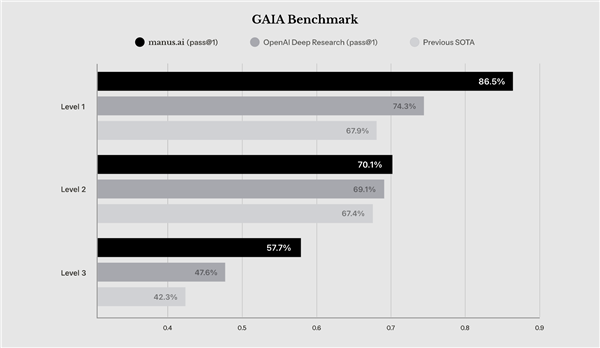 据团队介绍,Manus在GAIA基准测试中取得了SOTA(State-of-the-Art)的成绩,显示其性能超越Open AI的同层次大模型。