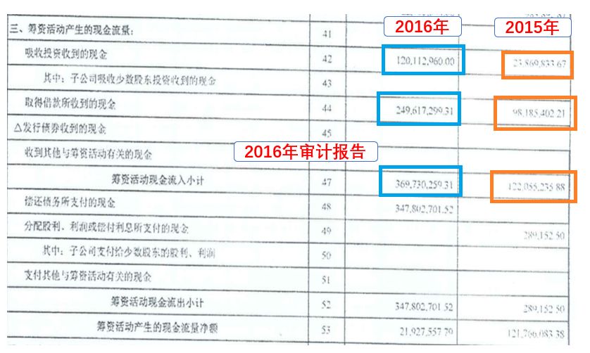 2016年点荣公司审计报告显示,公司吸收投资收到现金1.2亿元,取得借款2.496亿元,筹资活动累计收到现金3.697亿元。2015年,公司吸收投资收到的现金2387万元,取得借款9819万元,合计收到资金1.22亿元。