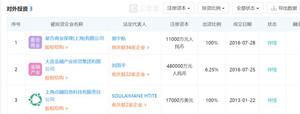 点融网的实际控制人中贷有限公司对外投资了3家公司,其中一家为大连金融产业投资集团有限公司,该公司法定代表人为刘国平,注册资本高达48亿,中贷有限公司持股6.25%。这家公司就是大连金投,也就是点融网2018年的战略投资方。