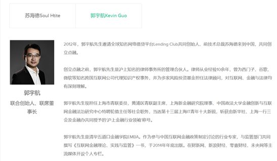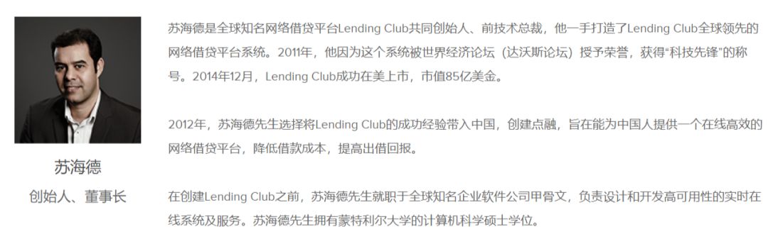 话说点融网也算中国P2P里最豪华的明星创业团队了,联合创始人苏海德(Soul Htite)曾是Lending Club的创始人之一,2007年创建Lending Club时担任CTO。另一名创始人郭宇航也是技术派,曾给Lending Club做技术外包服务。