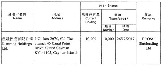 2017年12月,中贷有限公司将其全部股份转让给在开曼群岛注册的离岸公司点融控股有限公司(Dianrong Holdings Ltd.)。
