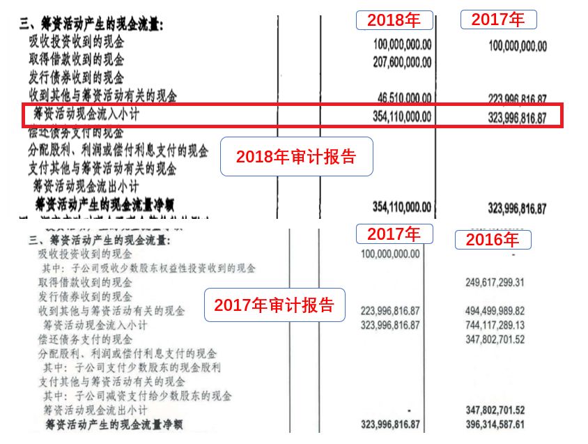 2018年,点荣公司吸收投资收到现金1亿元,取得借款2.076亿元,收到其他与筹资活动有关现金4651万元,2018年筹资活动共收到现金3.54亿元。这里面,除了第一笔1亿元为投资款外,第二笔疑似投资方或关联方采用了名股实债的方式,第三笔应该也是关联方借款。