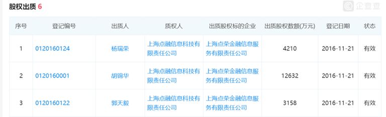 企查查信息显示,2016年11月21日,上海点荣金融信息服务有限责任公司的3名自然人股东胡锦华、郭天毅和杨瑞荣将各自全部股权质押给上海点融信息科技有限责任公司。