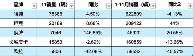 坦克品牌,主打硬派越野,但其新能源车型坦克 300 PHEV,30 万元的售价,让许多用户望而却步,2024年1-11月销量也只有 11.14 万辆。