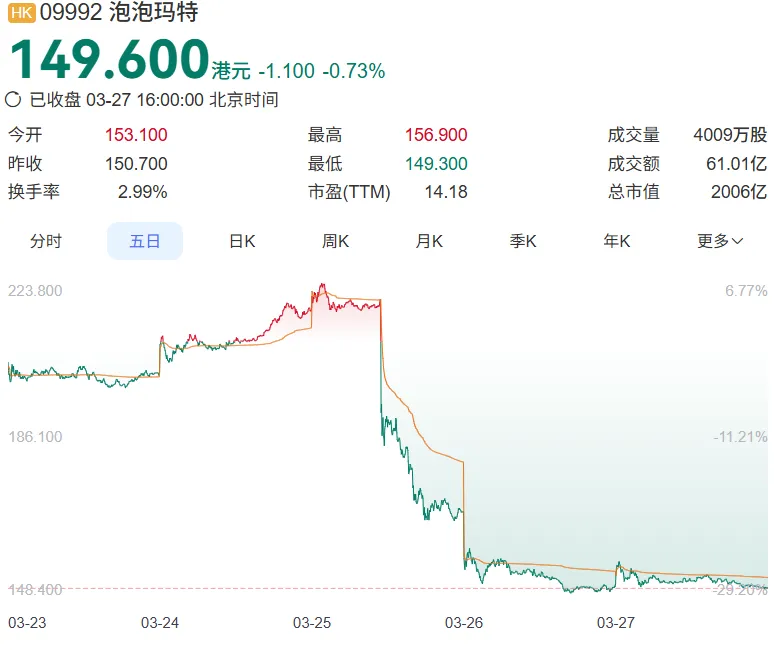 前日,泡泡玛特发布2025年财报后,股价遭遇“瀑布跌”,短短两日,从223港元直接跌到149.6港元,股价下跌了33%,市值跌去了三分之一。