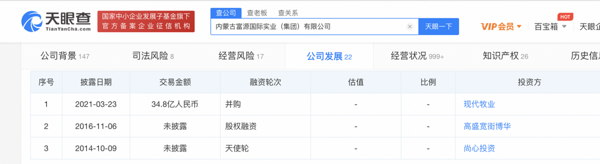 根据天眼查信息显示,去年3月份,现代牧业曾经以34.8亿人民币的交易金额并购内蒙古富源国际。并购带来的结果,就是财务并表后数据的增长,数据显示,收购富源国际也为现代牧业的原料奶销售量同比增加8.9%,达到159万吨。