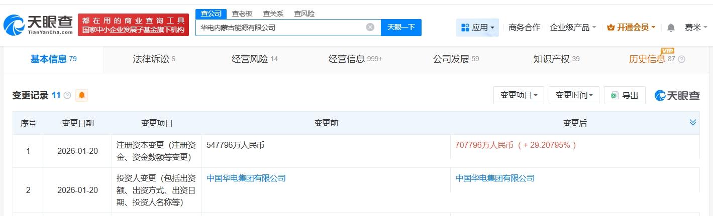 天眼查App显示,近日,华电内蒙古能源有限公司发生工商变更,注册资本由约54.8亿人民币增至约70.8亿人民币,增幅约29%。
