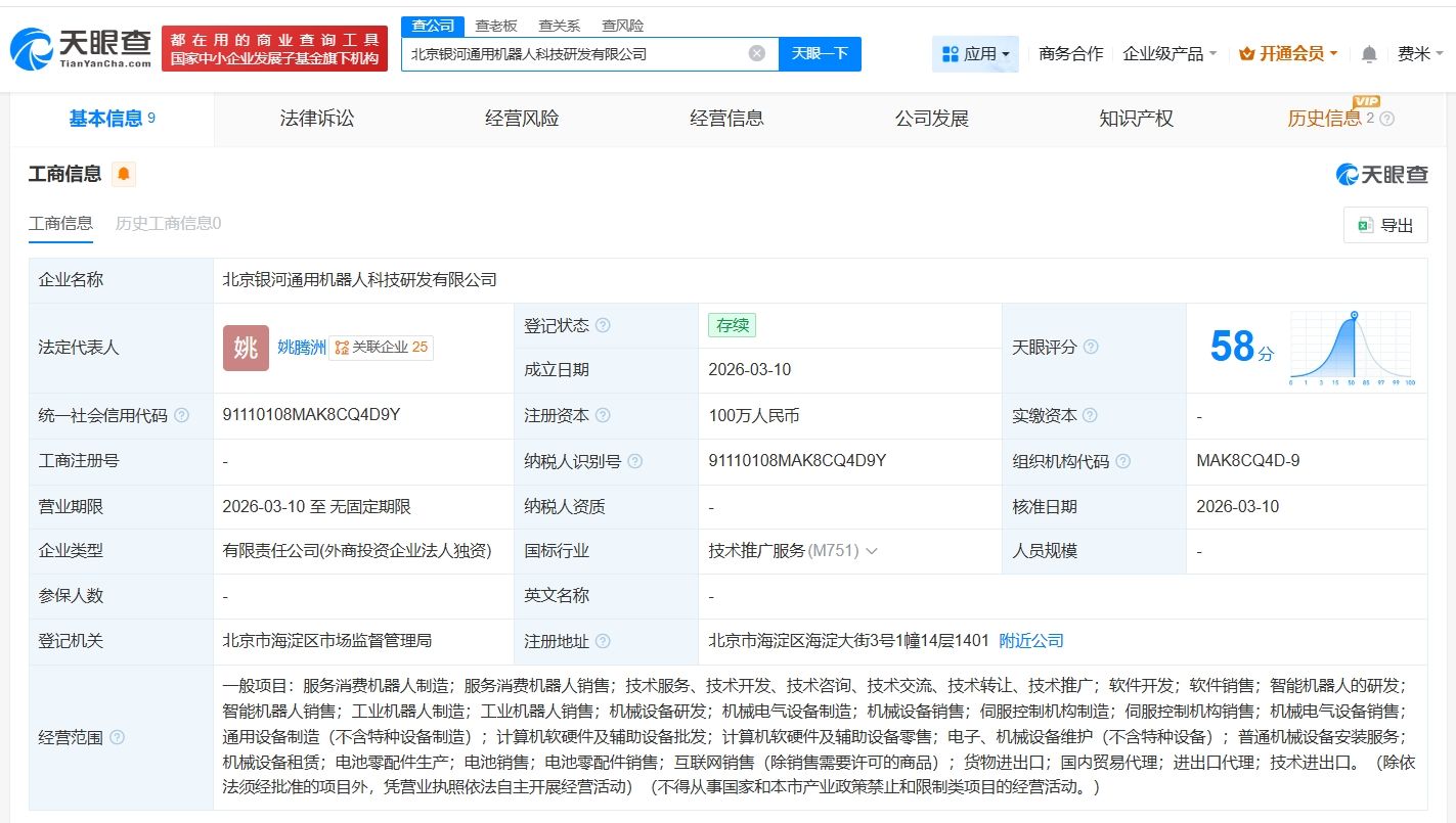 银河通用机器人成立科技研发公司 注册资本100万观点