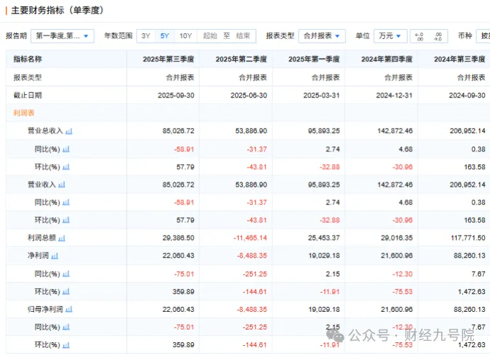 现金流的持续恶化是最直接的体现。根据公司现金流量表数据,2025年前三季度,公司经营活动现金流净额为-8.67亿元,同比由正转负,暴跌212.02%;投资活动现金流净额为-2.36亿元,筹资活动现金流净额为-6.16亿元,现金流净流出意味着公司资金持续消耗。