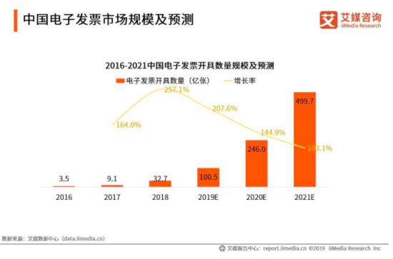 艾媒咨询数据显示,2017年我国电子发票开具量为9.1亿份,2018年就达到32.7亿份,年增长率达到257.1%,并预计2021年将高达约500亿份。