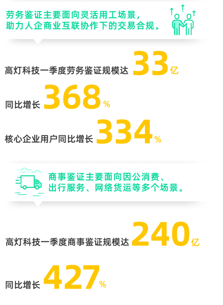 业绩报告显示,一季度高灯劳务鉴证规模同比增长368%,达到33亿元,核心企业用户同比增长334%。商事鉴证规模同比增长427%,达到240亿元。双双实现爆发式增长。