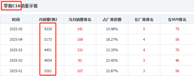 从数据来看,零跑C16的销量并没有很夸张,去年刚上市后,销量最高也就在8000辆左右,年后趋于平稳,最近几个月一直在5000辆左右,5月份已经降至4339辆。