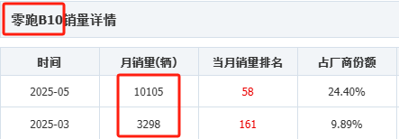 零跑5月销量突破主要和B10的上市有一定关系,5月份销量从3298辆升至10105辆。
