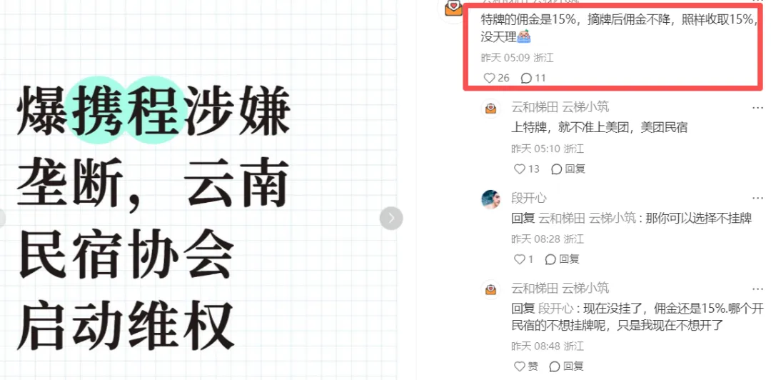 有网友表示携程特牌的佣金是15%,摘牌后佣金不降,照样收取15%,而且上特牌,就不准上美团,美团民宿。