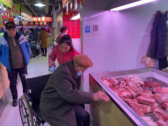 “没关系,下次来再给。”肉摊的方大姐怕胡阿姨拎不动,还嘱咐老公给她送到家门口。
