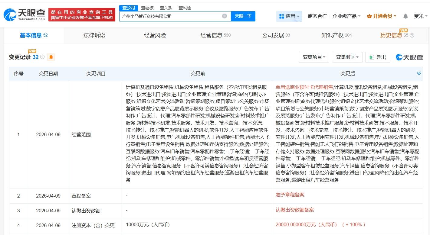 天眼查App显示,近日,广州小马智行科技有限公司发生工商变更,注册资本由1亿人民币增至2亿人民币,增幅100%。