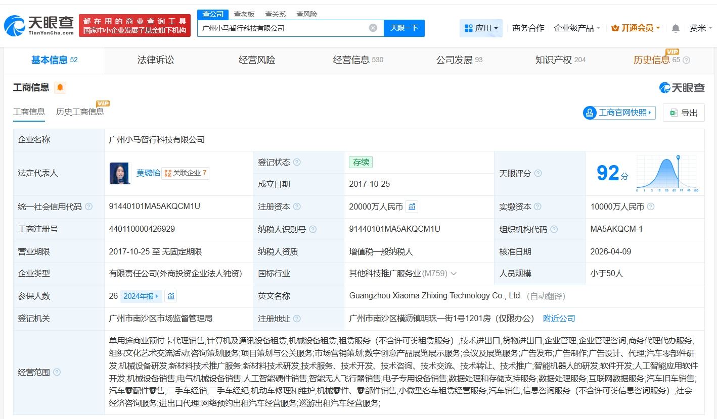 该公司成立于2017年10月,法定代表人为莫璐怡,经营范围包括单用途商业预付卡代理销售、计算机及通讯设备租赁、机械设备租赁等,由广州小马慧行科技有限公司全资持股。