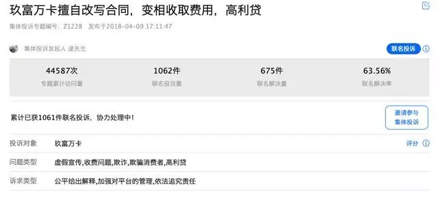 其中,不少投诉贴的标题均出现了“砍头息”、“高利贷”、“高额费用”及“变相收费”等关键字。中访网翻阅投诉贴发现,一篇涉及“擅自改写合同,变相收取费用,高利贷”的联名投诉专题(编号:Z1228)中,投诉发起人逯先生称:玖富万卡平台擅自改写借款合同,而且收取高额利息及高额服务费,在未通知借款人的情况下,制造虚假合同,擅自添加修改借款账单让借款人还款。借款后不仅需要偿还本金及正常利息,还需支付服务费以及服务费还需要利息,以各种方式变相收取高额费用。